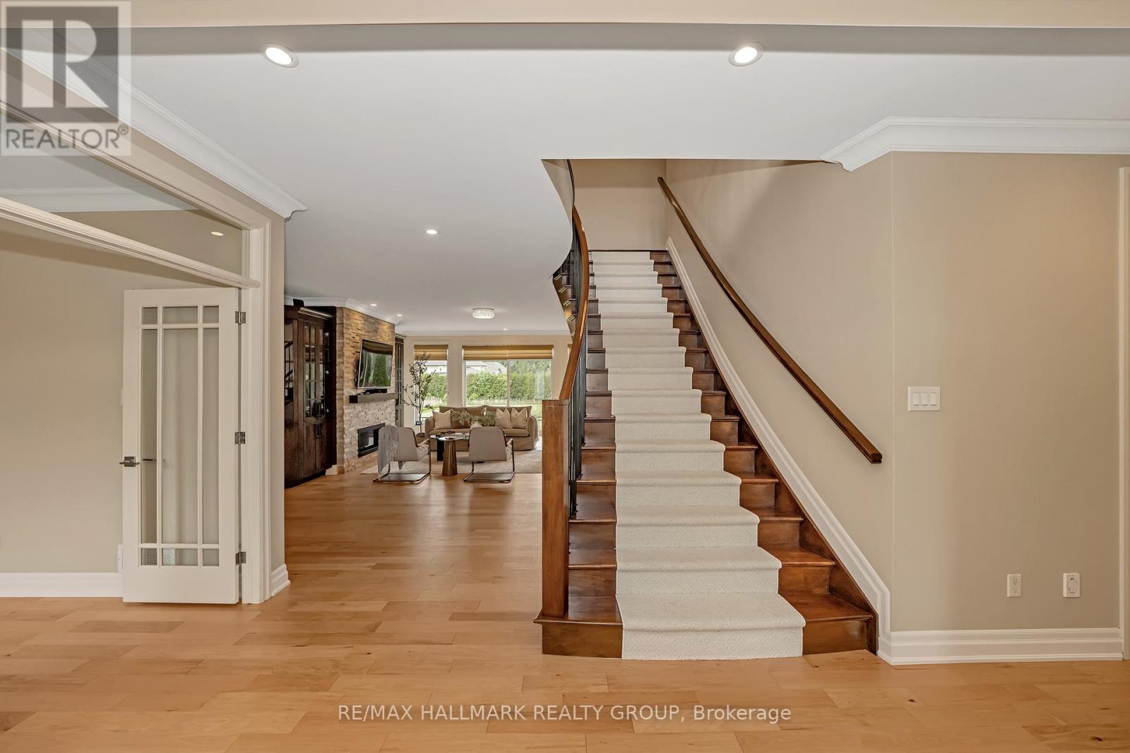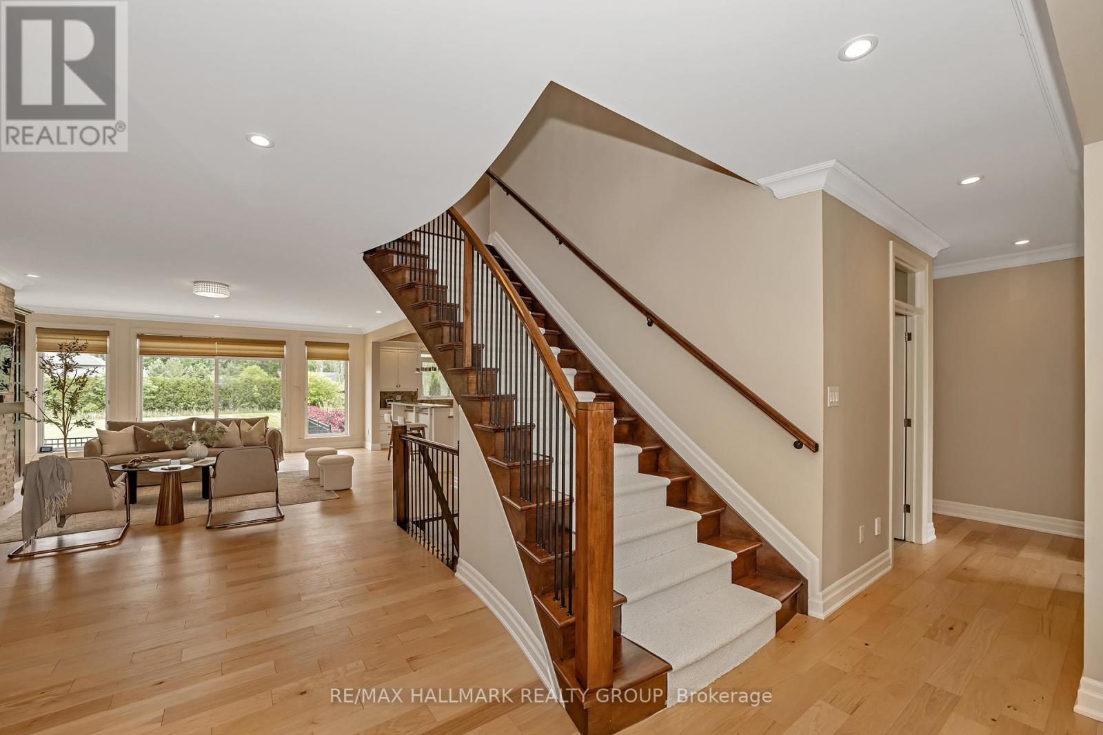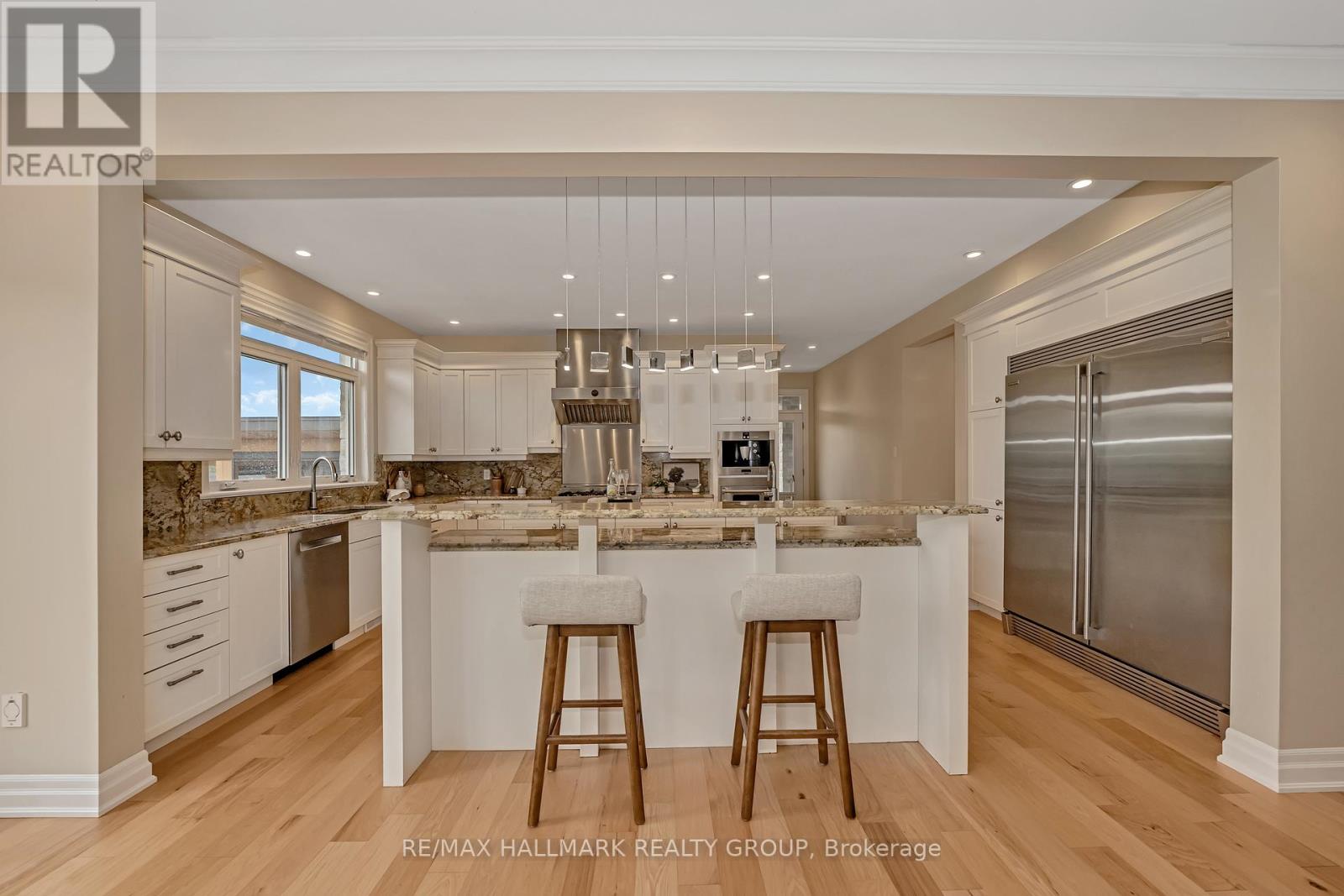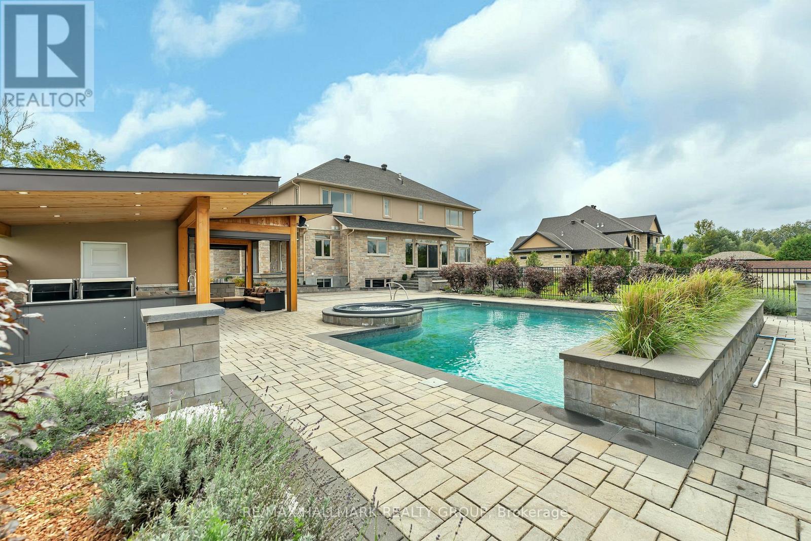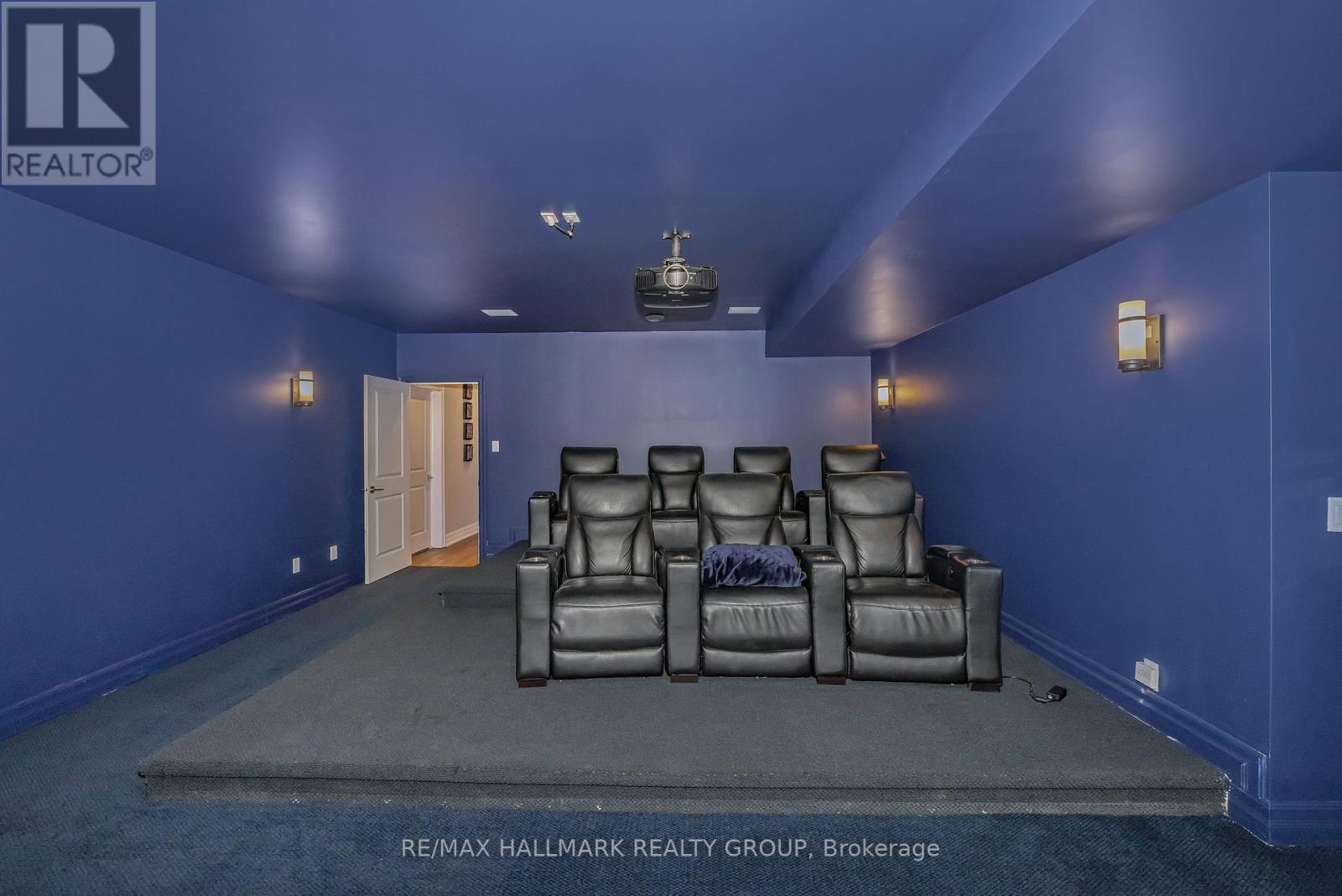 Welcome to this extraordinary estate in the prestigious Rideau Forest community of Manotick. Set on a beautifully landscaped lot, this custom-built residence offers over 7,000 sq. ft. of impeccably designed living space, tailored for both family comfort and grand-scale entertaining. Step inside to a light-filled main floor where elegance meets functionality. The luxurious primary suite is conveniently located on the main level, complete with a spa-inspired ensuite with heated floors and spacious walk-in closet. Each of the four additional bedrooms upstairs feature their own private ensuite and walk-in closet, offering unparalleled privacy and comfort. The heart of the home is the show-stopping chefs kitchen, boasting dual islands, a massive walk-in pantry, and premium appliances, perfect for both casual family meals and gourmet entertaining. A dedicated main floor office provides a quiet retreat for work or study. Unique to this home are two separate garages , two car on each side each leading into well-appointed mudrooms, offering ample storage and family-friendly convenience. Upstairs, a versatile loft area and a large laundry room add to the home's thoughtful layout. The finished lower level is an entertainers dream, featuring a kitchen and bar area, private movie theater that seats 7 in world class recliners, a fitness studio, lounge space, and a luxurious bathroom with a steam shower. Step outside to your private oasis, a resort-style pool with waterfall Hot Tub, complete with a fully equipped pool house and an outdoor kitchen, and lounge area with TV and surround sound, gas fireplace, bar and remote controlled screens, perfect for summer gatherings. Every detail of this home reflects quality, style, and timeless sophistication. An exceptional opportunity to own one of Manoticks finest estates. (id:2469)